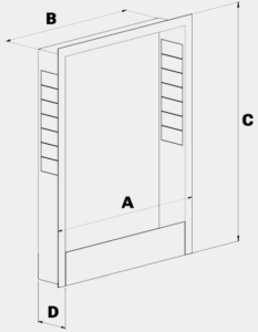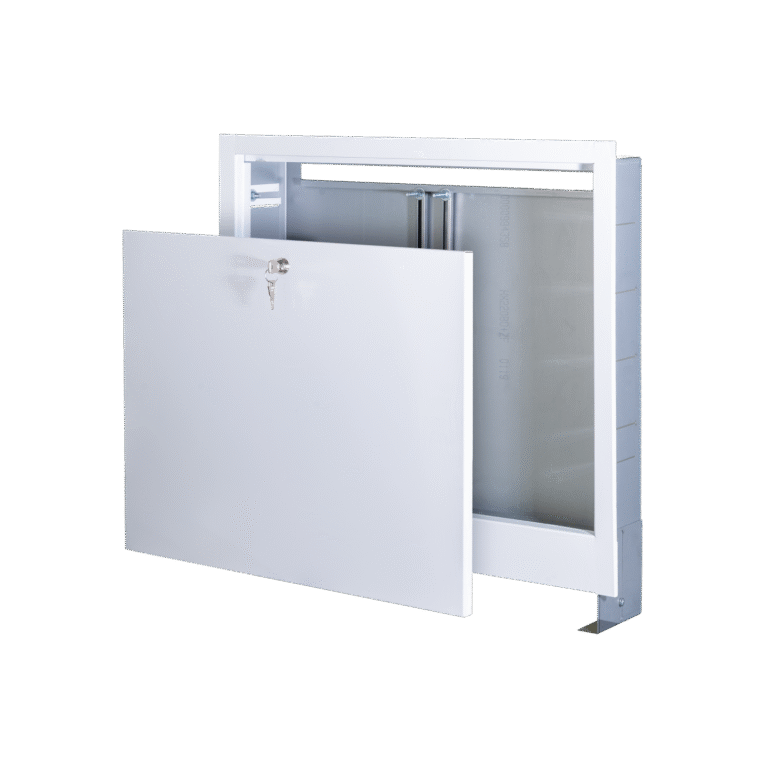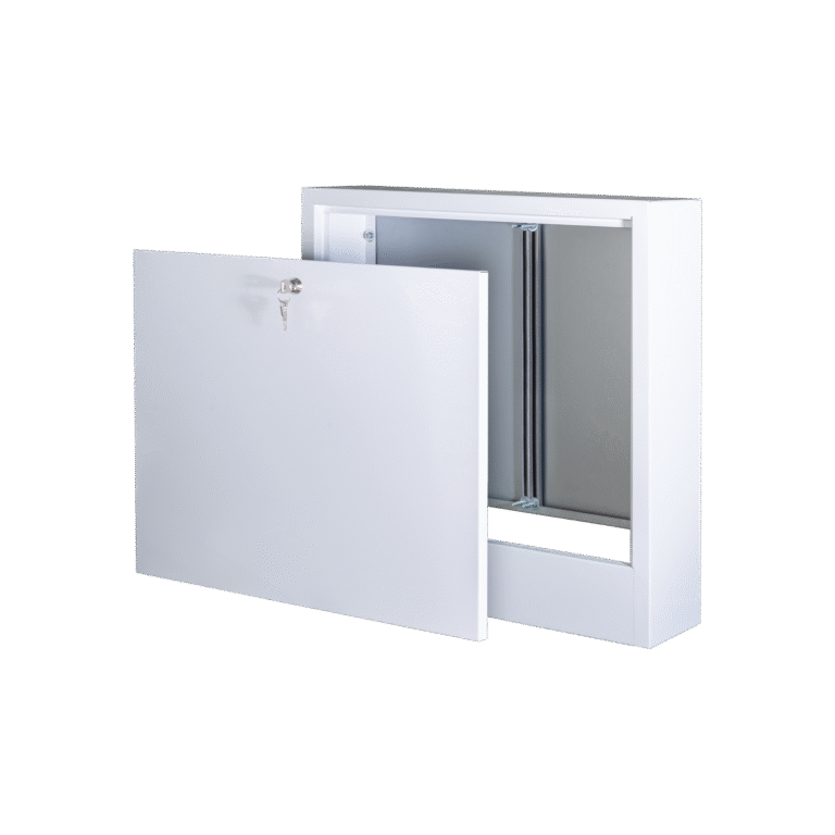 Armários embutidos e montados na superfície, feitos de chapa galvanizada, são projetados para a instalação de distribuidores na faixa de 2 a 16 circuitos. As frentes dos armários são revestidas a pó branco (RAL 9016).