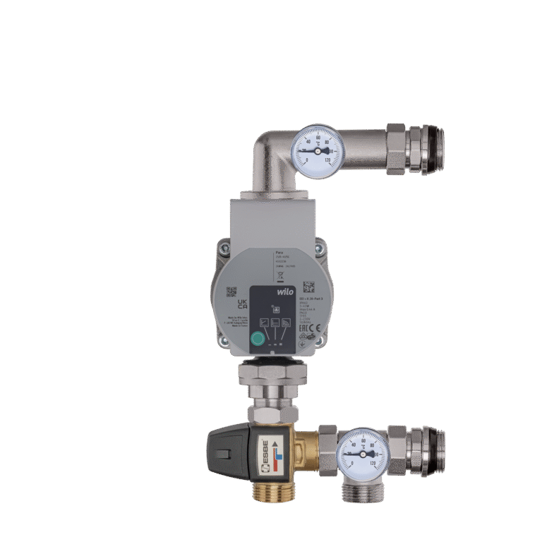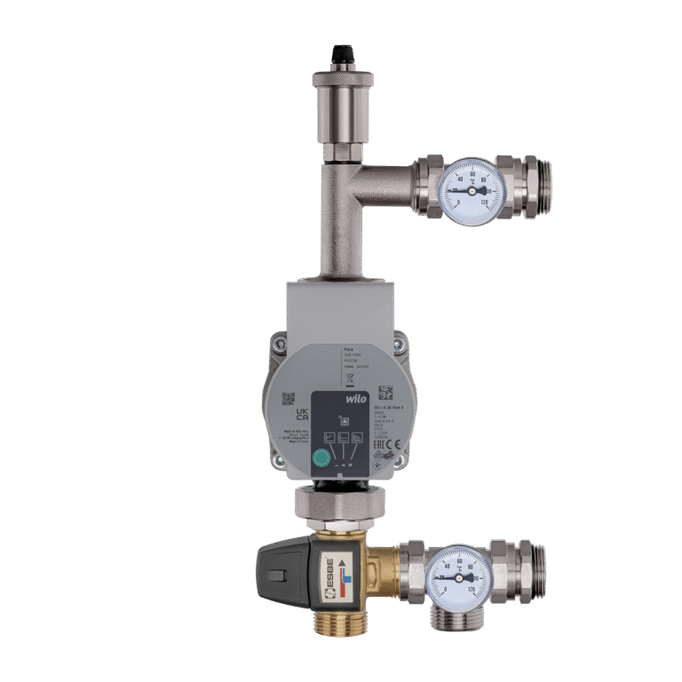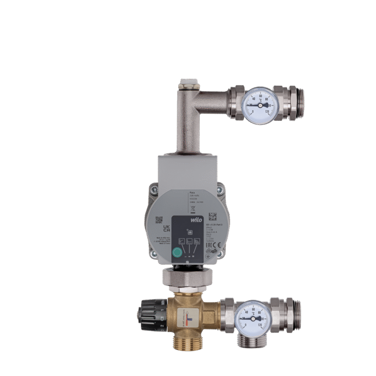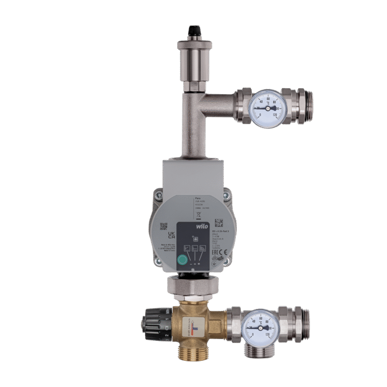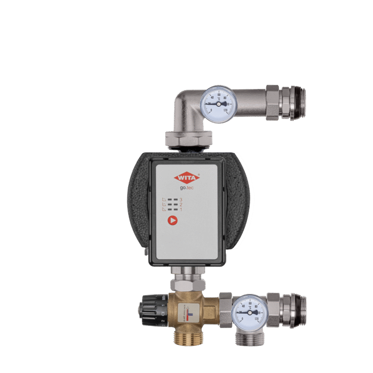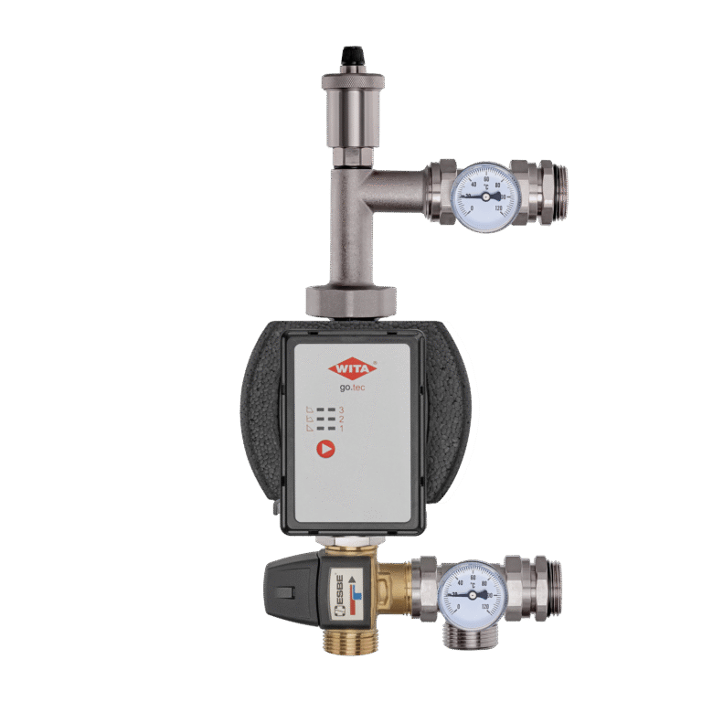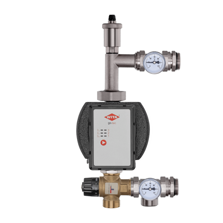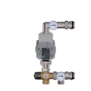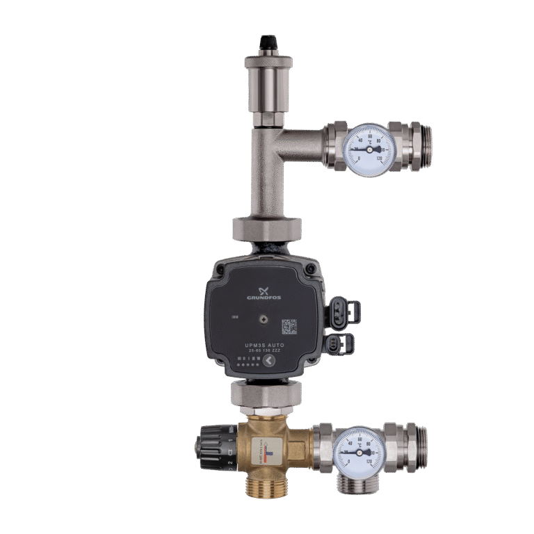Os conjuntos de mistura de latão (grupos de mistura) consistem em uma bomba de circulação, uma válvula de três vias (bimetal), termômetros e uma válvula de ventilação.